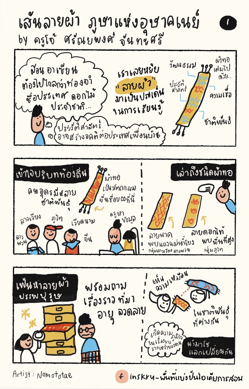 ชั่วโมงต่อมา ครูได้ให้นักเรียนศึกษาผ้า ในแต่ละกลุ่มชาติพันธุ์ในอุษาคเนย์ทั้งบนแผ่นดิน และเกาะต่าง ๆ โดยพิจารณาจากเส้นใยที่ใช้ทอ ลวดลายบนผืนผ้า สีที่ใช้บนผืนผ้า