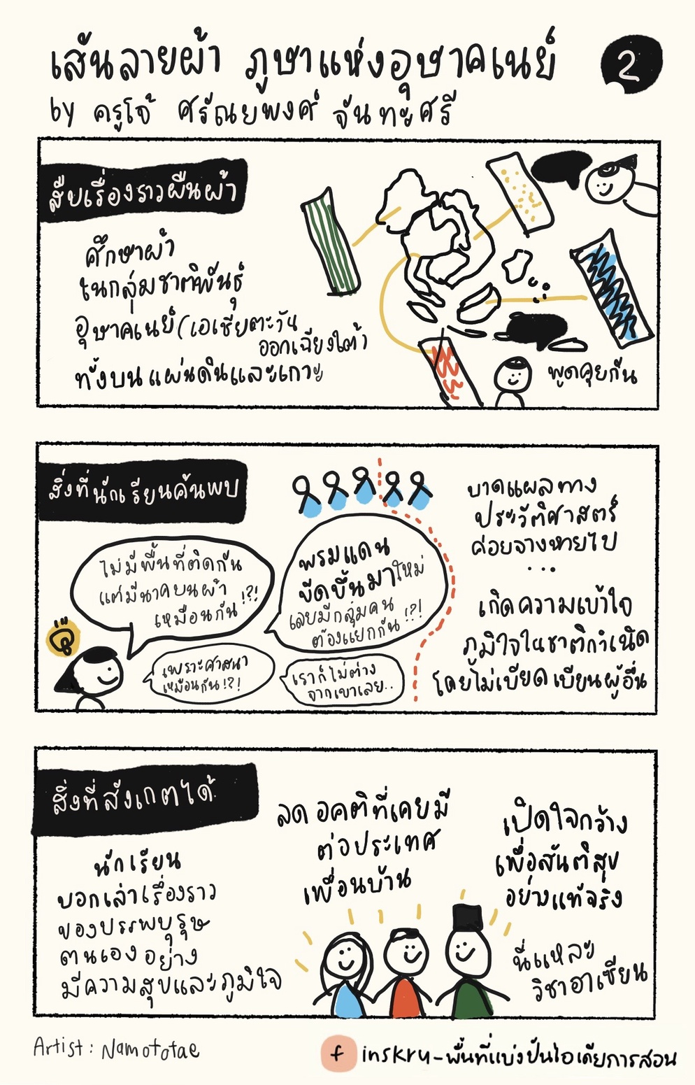จึงเกิดเป็นการออกแบบการสอนอาเซียนศึกษา ที่ไม่ใช่แค่การท่องจำชื่อประเทศ เมืองหลวง ดอกไม้ประจำชาติ แต่เป็น การหยิบเอาศิลปวัฒนธรรมในท้องถิ่น มาเป็นหลักในการเล่าเรื่อง
