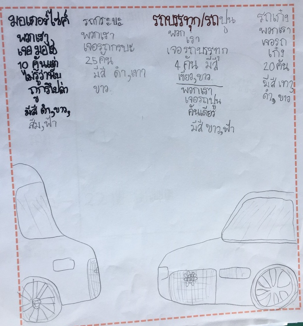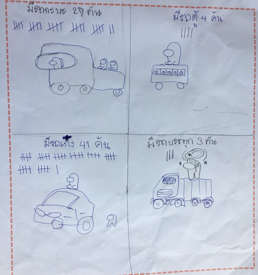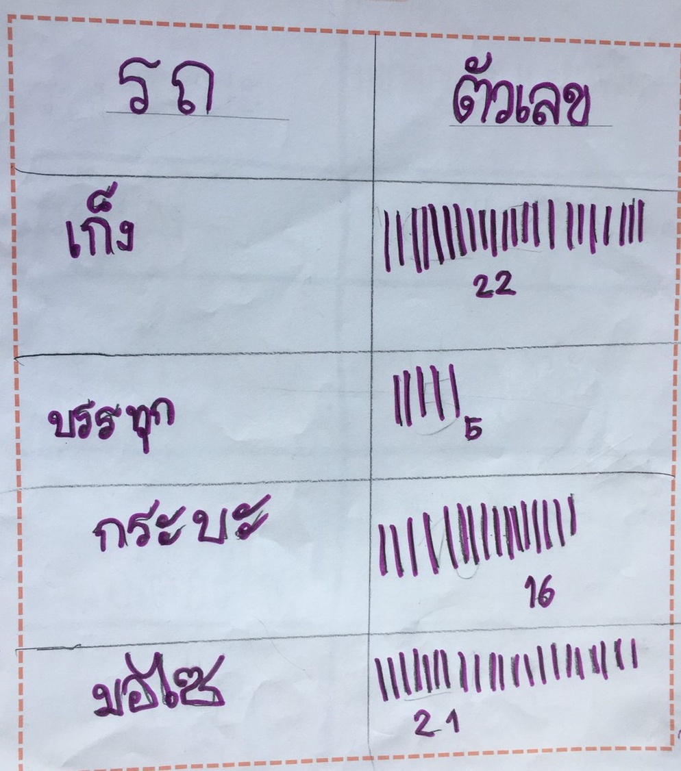 จากข้อมูลที่นักเรียนมี ไม่มีกลุ่มไหนรู้เลยว่ารถที่วิ่งผ่านหน้าโรงเรียนไป ภายในเวลา 5 นาที มีทั้งหมดกี่คัน และมีกี่ประเภท ประเภทละกี่คัน นักเรียนจึงต้องนำข้อมูลที่ตนเองได้ ไปจัดให้อยู่ในรูปแบบตาราง เพื่อให้คนดูเห็นและเข้าใจง่าย