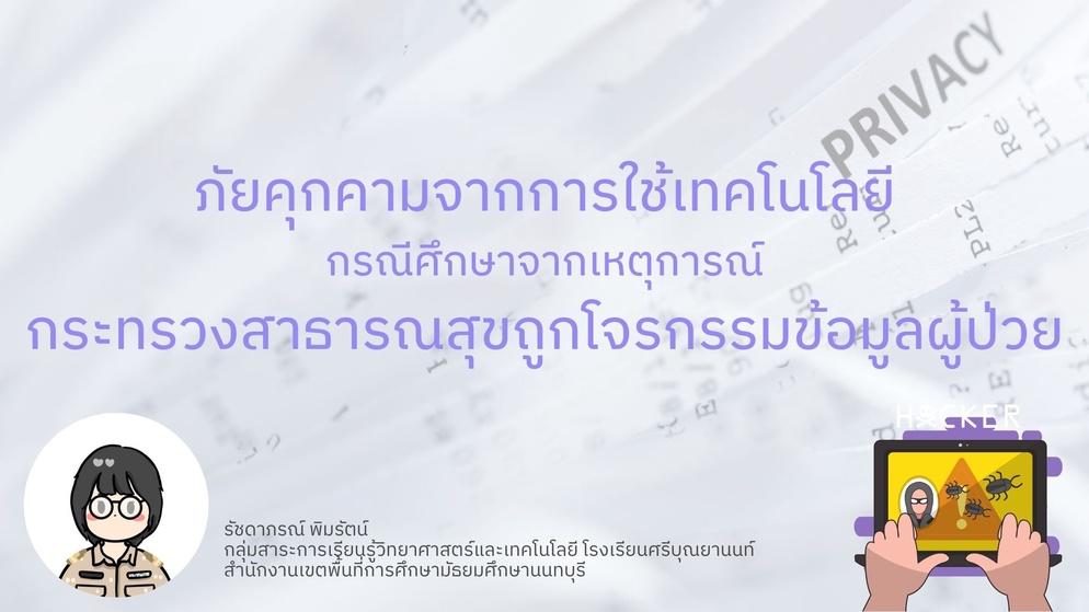 ข่าวด่วนชวนนำเข้าสู่บทเรียนวันนี้ จากข่าวกระทรวงสาธารณสุขถูกโจรกรรมข้อมูลผู้ป่วย นำไปสู่บทเรียนเรื่อง ภัยจากการใช้เทคโนโลยีสารสนเทศ บทที่ 6 รายวิชาวิทยาการคำนวณ ระดับชั้น ม.1