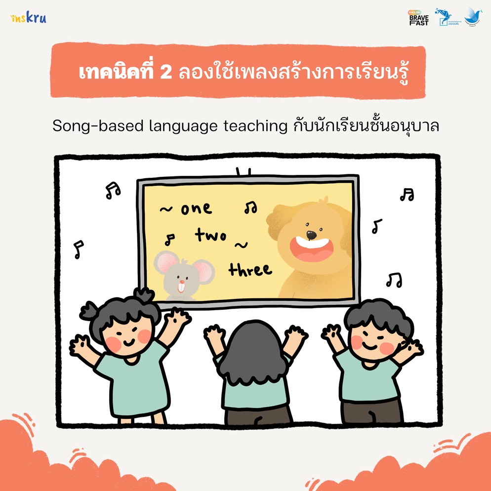 คุณครูสามารถเลือกใช้เพลงต่าง ๆ ได้จาก YouTube channel: Super Simple Songs - Kids Songs ซึ่งจะมีเพลงในหมวดต่าง ๆ ที่เหมาะสมกับช่วงวัยของนักเรียน เช่น คลิปวิดีโอ “I see something blue” ที่สอนเรื่องสีต่าง ๆ รอบตัว และการแต่งประโยคโดยใช้โครงสร้าง I see something ... หรือ คลิปวิดีโอ “I have a pet” ที่สอนคำศัพท์ที่เกี่ยวข้องกับสัตว์เลี้ยง และการแต่งประโยคโดยใช้ subject pronoun เช่น I have a/an ..., She is a/an ...