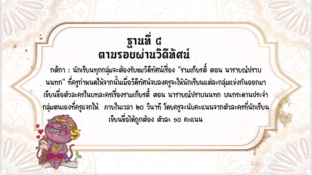 กติกา คือ นักเรียนทุกกลุ่มจะต้องรับชมวิดีทัศน์เรื่อง “รามเกียรติ์ ตอน นารายณ์ปราบนนทก” ที่ครูกำหนดให้ (คุณครูสามารถปรับเปลี่ยนวิดีทัศน์ตามความสนใจและความเหมาะสมของเวลาได้)จากนั้นเมื่อวิดีทัศน์จบลงครูจะให้นักเรียนแต่ละกลุ่มแข่งกันออกมาเขียนชื่อตัวละครในบทละครเรื่องรามเกียรติ์ ตอน นารายณ์ปราบนนทก บนกระดานประจำกลุ่มตนเองที่ครูแจกให้ ภายในเวลา ๒๐ วินาที โดยครูจะนับคะแนนจากตัวละครที่นักเรียนเขียนชื่อได้ถูกต้อง ตัวละ ๑๐ คะแนน