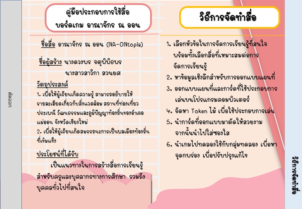 สื่อการสอนเป็นลักษณะบอร์ดเกมเพื่อใช้ทบทวนเนื้อหาการเรียนการสอนในรายวิชาท้องถิ่นของเรา โดยเป็นเกมที่ทำให้ผู้เล่นได้ฝึกในด้านการวางแผนและได้เรียนรู้เกียวกับแผนที่ ทรัพยากรและสถานที่สำคัญของอำเภอแม่ออนและเกิดความตระหนักในการช่วยกันอนุรักษ์ทรัพยากรธรรมชาติและสิ่งแวดล้อมรอบตัวให้คงอยู่ต่อไป