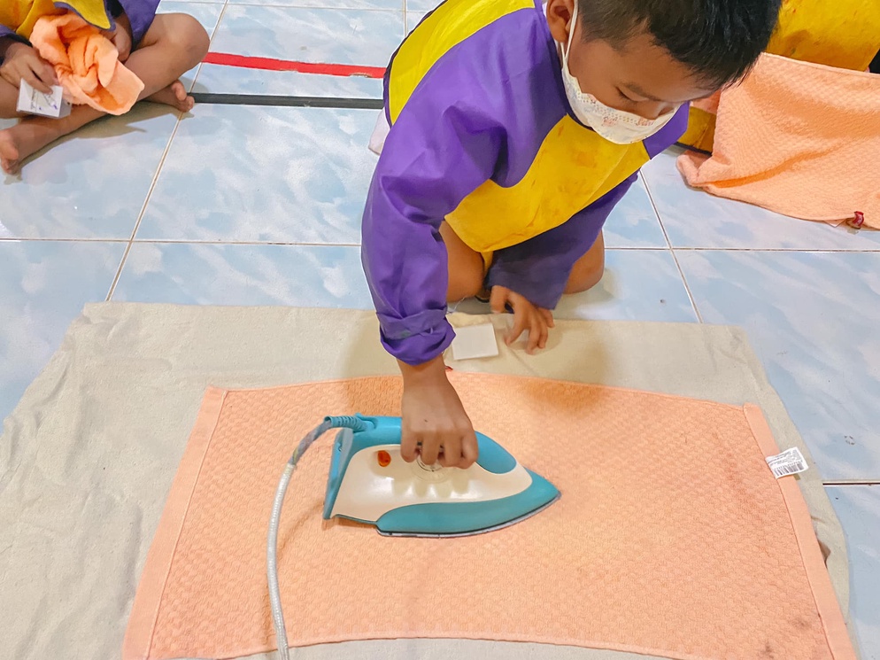 วิธีการดีลกับไฟด้วยการทำศิลปะด้วยการระบายสีลงในกระดาษทรายและลนไฟเพื่อให้สีละลาย ต้องคอยระวังไม่ให้กระดาษไหม้ ถ้าไกลไฟไปสีก็จะไม่ละลาย ใกล้ไฟไปกระดาษก็จะขาด ได้ลองควบคุมเอง จับเทียนเอง แต่จุดคุณครูยังต้องจุดให้อยู่เพราะเด็กๆลองใช้ไฟแช็กแล้วจุดไม่ติิด