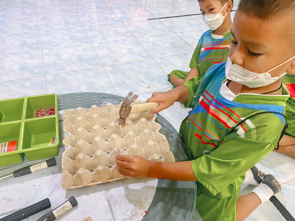 ต่อมาคือการฝึกใช้ของมีคม เด็กๆฝึกใช้กรรไกรตัดกระดาษกันจนชำนาญแล้ว วันนี้เลยเน้นการใช้มีดเป็นหลัก