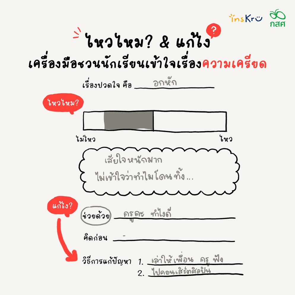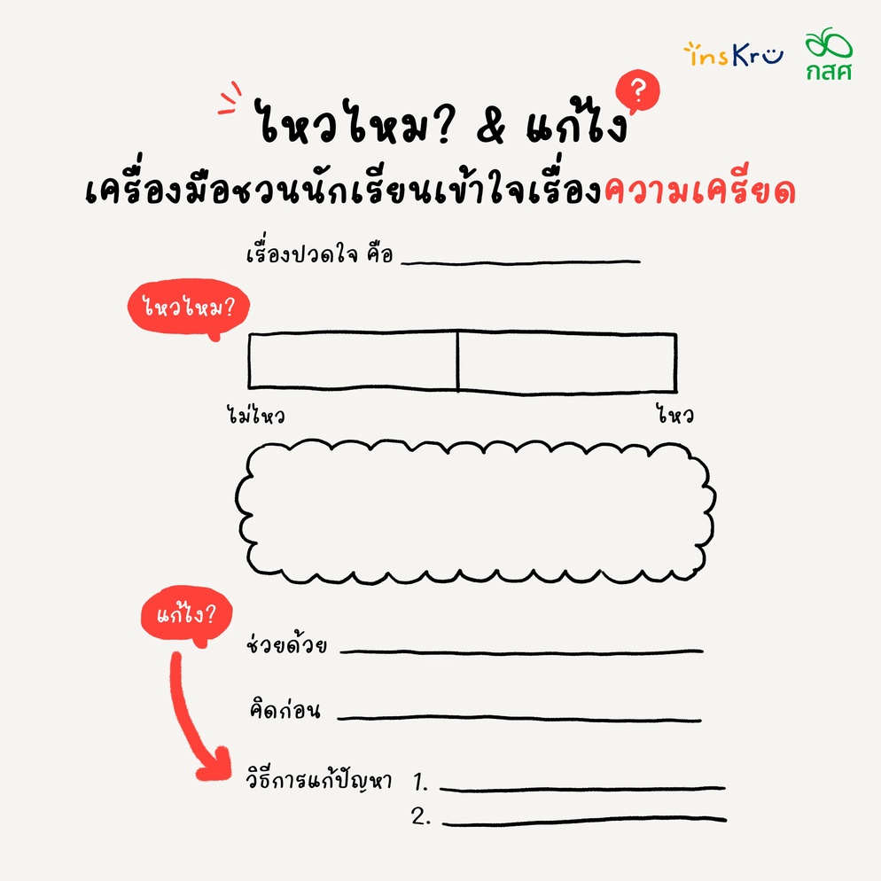 โดยเครื่องมือ ไหวไหม? & แก้ไง? นั้น จะเป็นเครื่องมือที่ค่อย ๆ ช่วยให้นักเรียนได้ตกผลึก เรียบเรียงความคิด เกี่ยวกับความเครียดในเรื่อง ๆ หนึ่งที่ตนเองกำลังเผชิญอย่างเป็นระบบ โดยเริ่มจาก