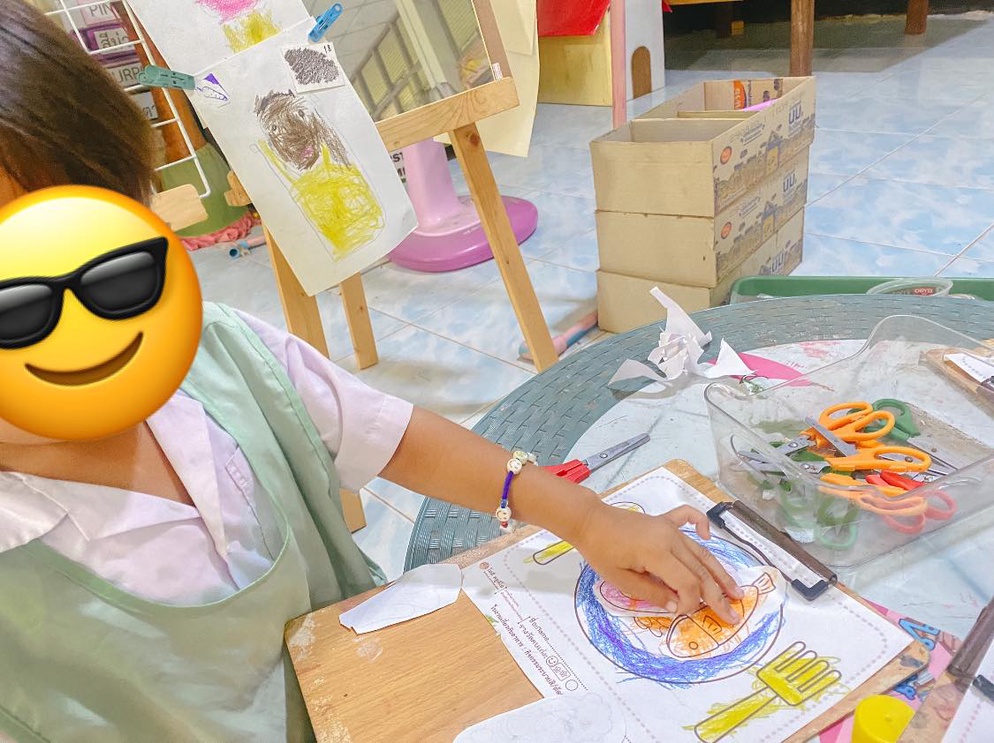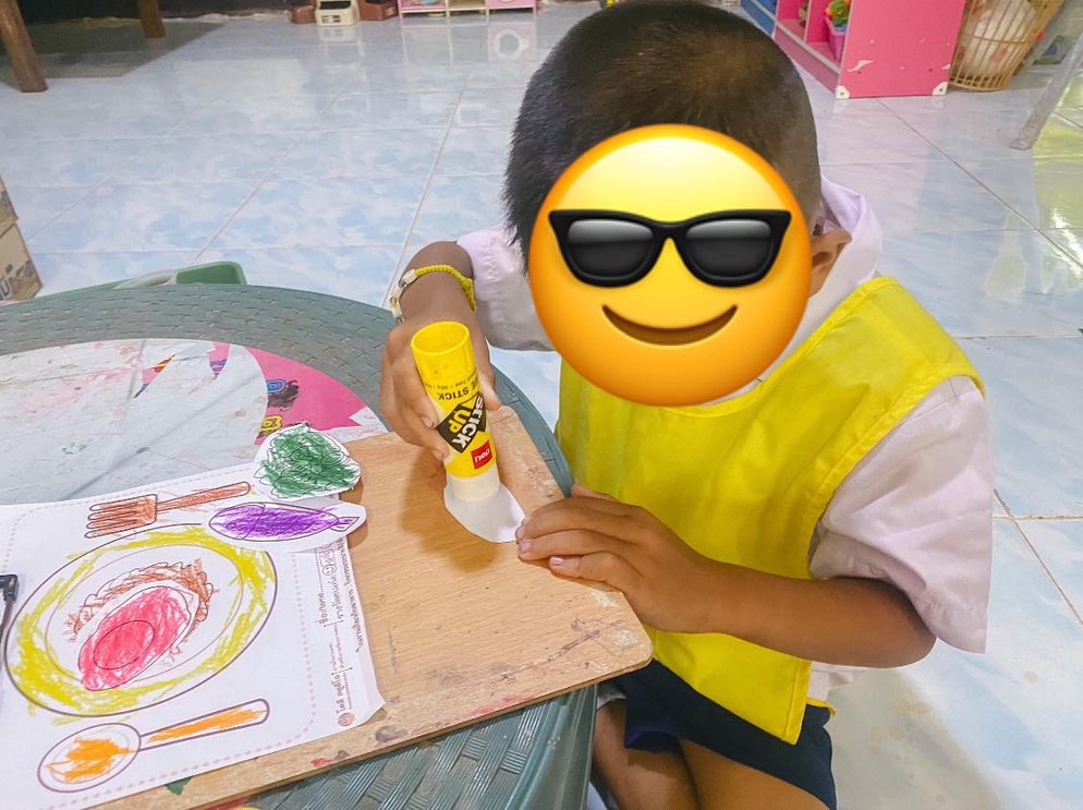 นอกจากได้จัดจานอาหารแล้ว ยังได้ฝึกตัดกระดาษ และติดกาวเอง