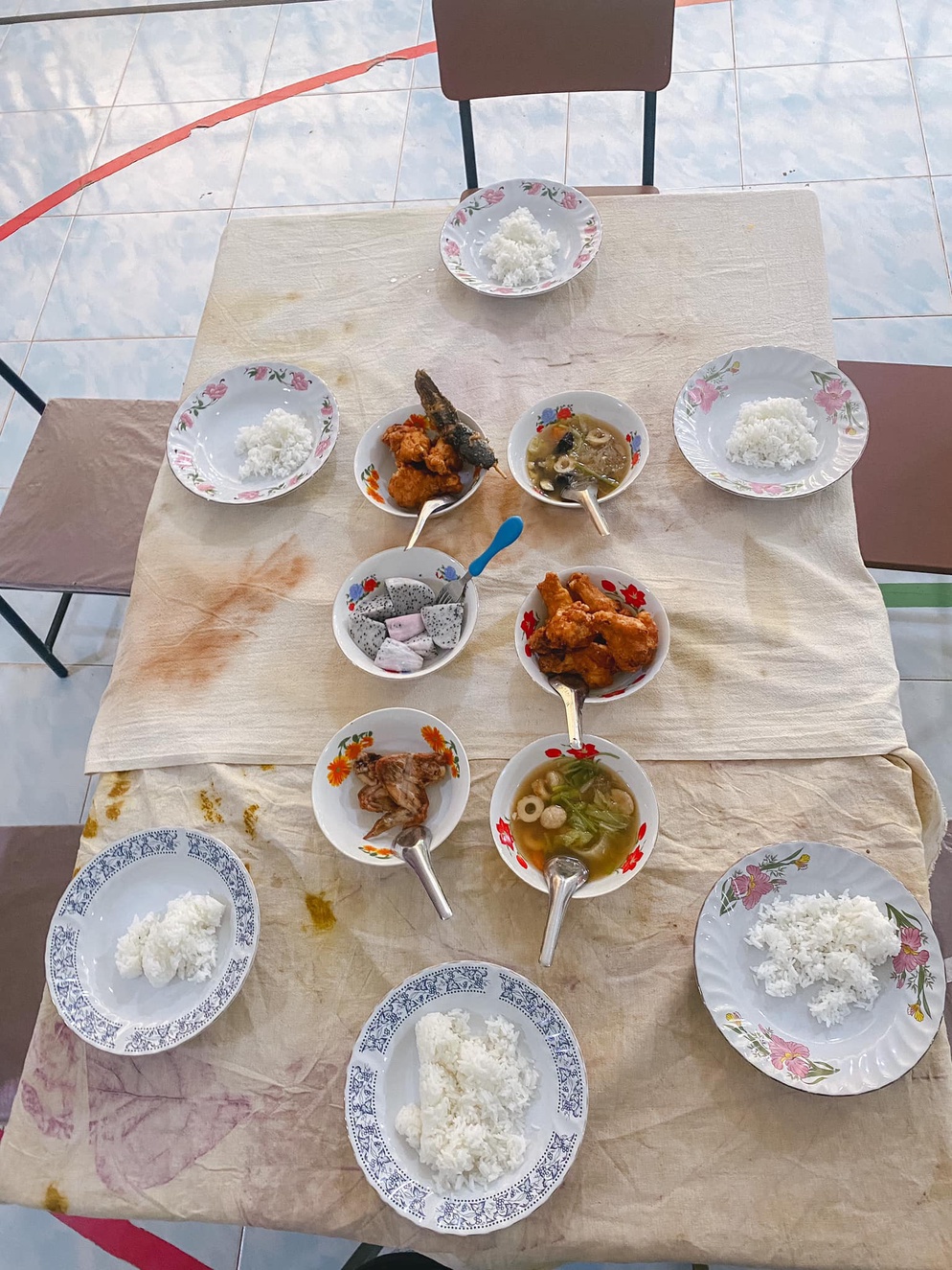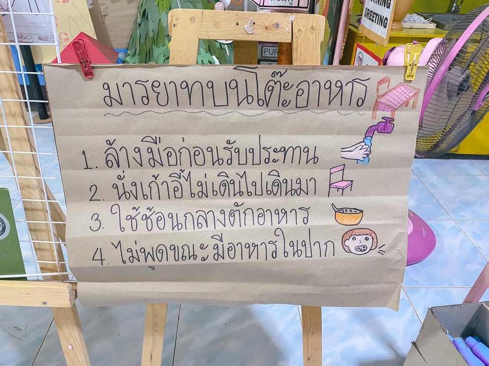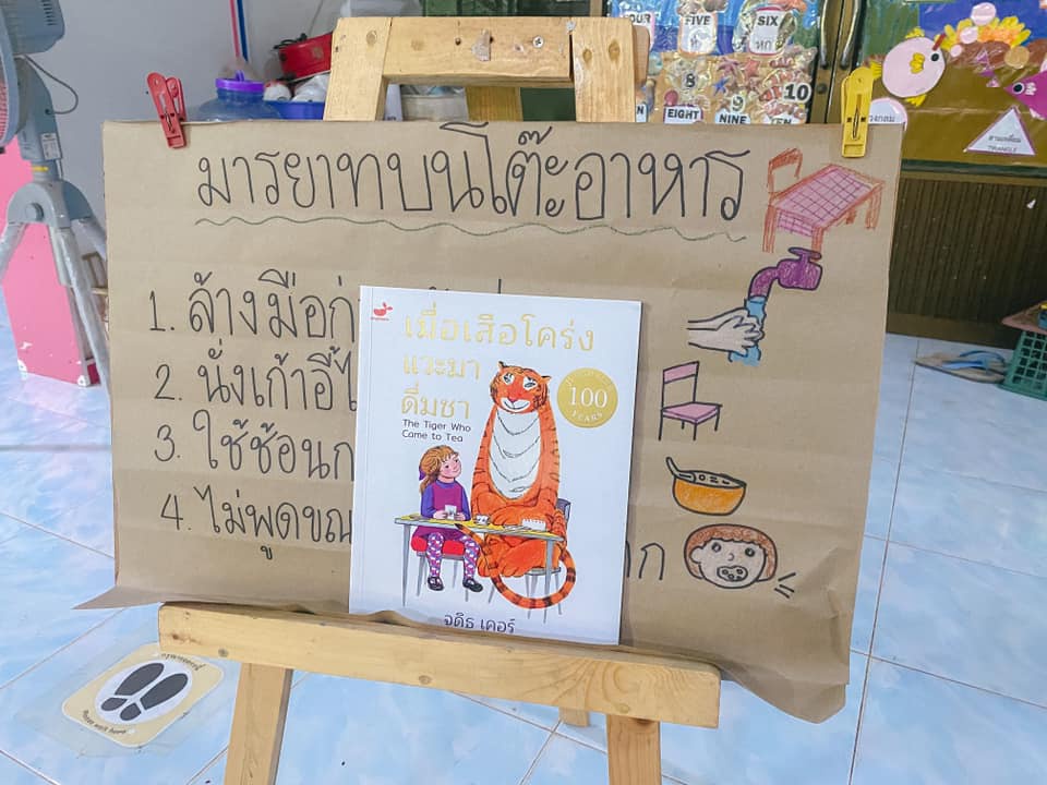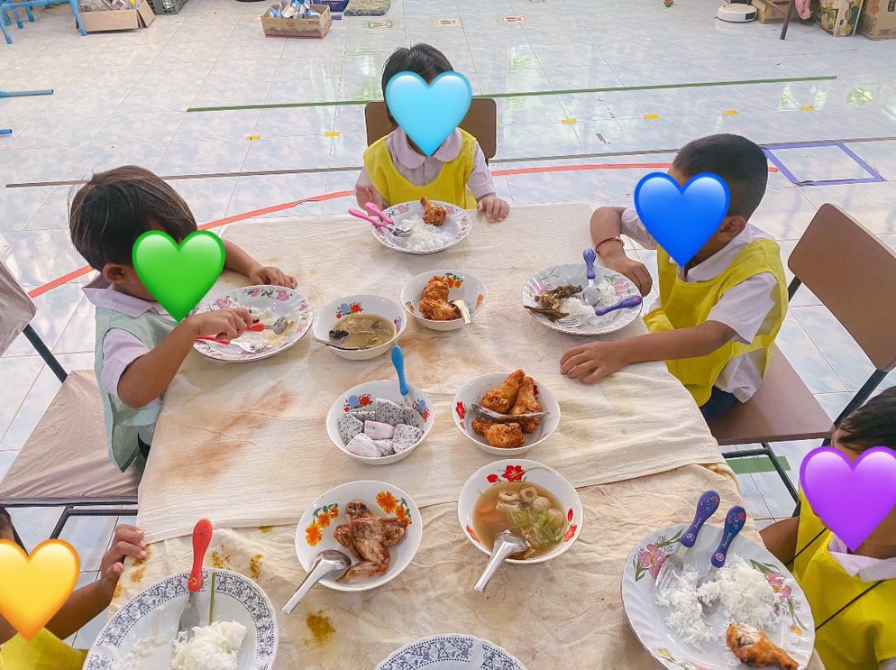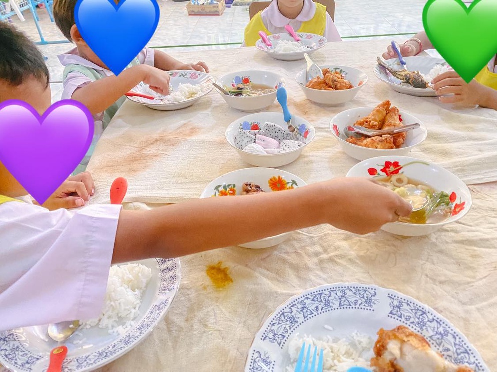 และเมื่อฟังนิทานจบก็มาช่วยกันจัดโต๊ะอาหาร โดยอาหารต่างๆเด็กๆนำมาจากบ้านคนละอย่าง รวมกับอาหารกลางวันโรงเรียน ส่วนคุณครูนำข้าวมา