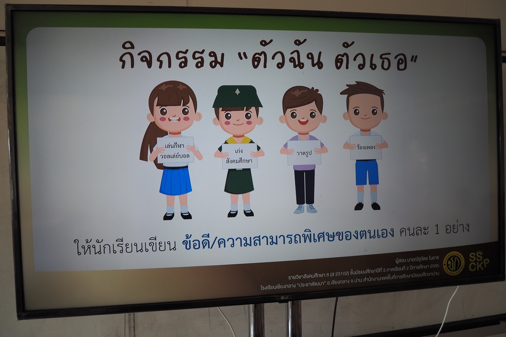 เริ่มต้นชั่วโมงด้วยกิจกรรม “ตัวฉัน ตัวเธอ” โดยครูแจกโพสต์อิท หรือกระดาษให้นักเรียนคนละ 1 แผ่น ครูให้นักเรียนทุกคนเขียน ข้อดี/ความสามารถพิเศษของตนเอง คนละ 1 อย่าง ครูสรุปข้อดี หรือความสามารถพิเศษของนักเรียนแต่ละคนบนกระดาน (ช่วงนี้จะได้เสียงเฮฮา เสียงแซวเพื่อน และทำให้ครูได้เรียนรู้ความชอบ ความถนัดและความสามารถพิเศษของนักเรียนแต่ละคนด้วย) ครูใช้คำถามถามนักเรียน เกี่ยวกับการนำความสามารถของนักเรียนแต่ละคนมาแสดงหรือนำมาใช้ เช่น ถ้าครูจะพานักเรียนไปแข่งตอบปัญหาทางสังคมศึกษาครูจะติดต่อนักเรียนคนใด ถ้าครูจะจัดคอนเสิร์ตครูจะขอนักเรียนคนใดมาช่วย ครูเชื่อมผลที่ได้จากกิจกรรมเข้าเนื้อหาการค้าระหว่างประเทศของไทย เช่น
