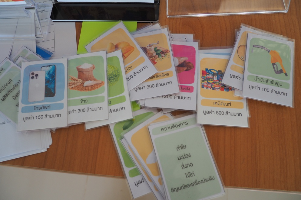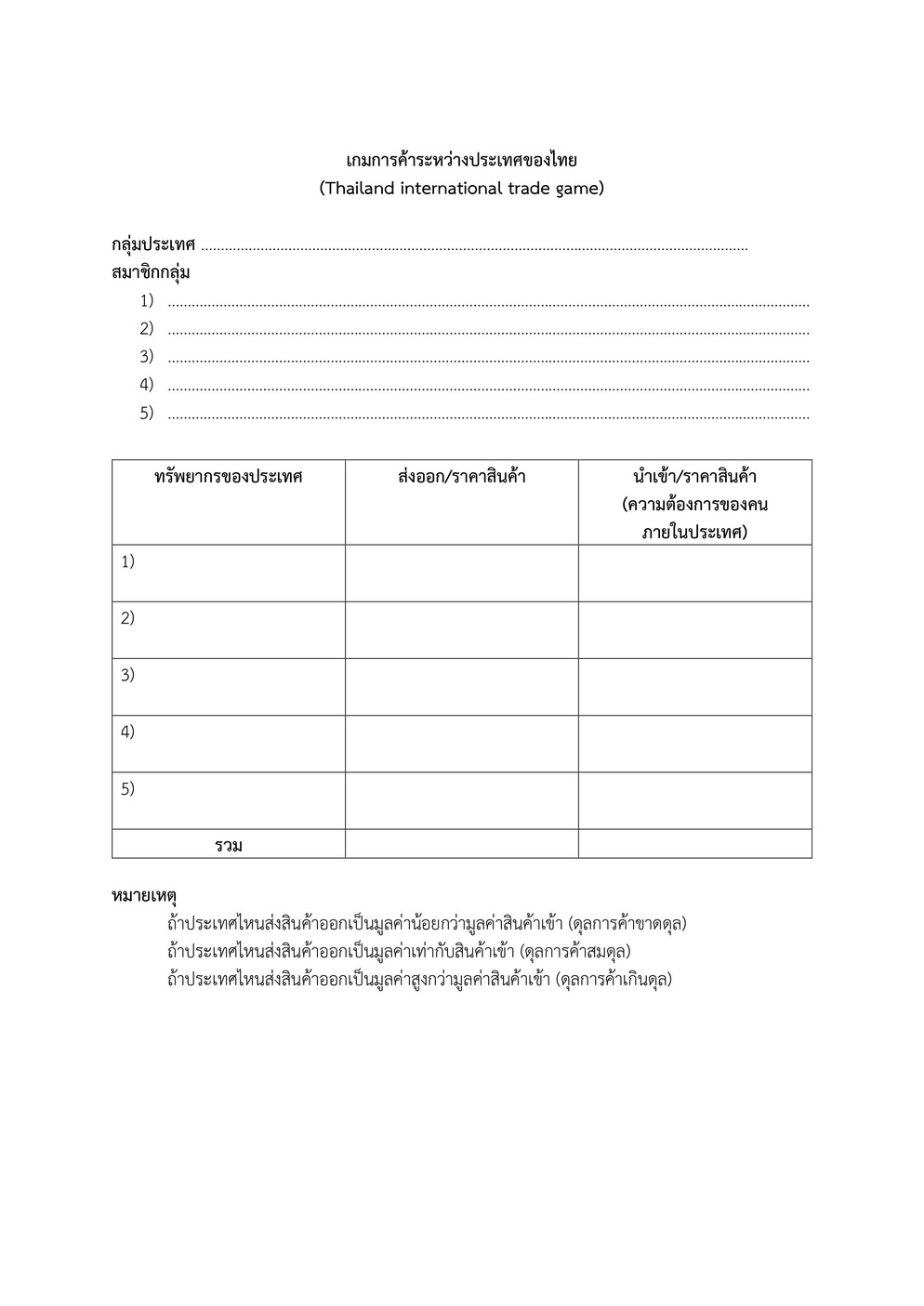 นักเรียนทำกิจกรรมเล่นเกมการค้าระหว่างประเทศของไทย (Thailand's international trade game) โดยมีขั้นตอนการเล่นดังนี้