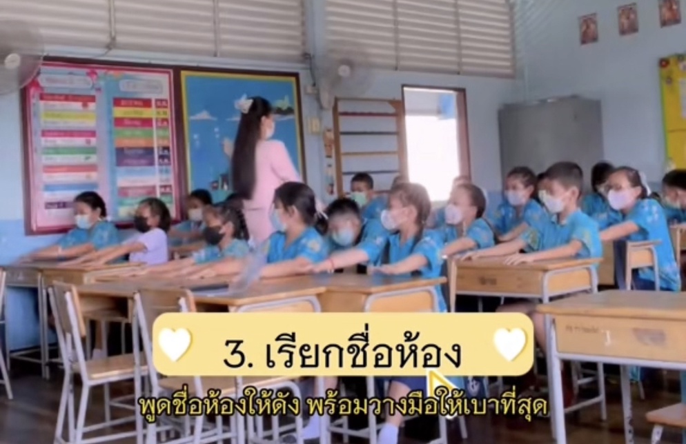 🖊️ เมื่อครูเรียกชื่อห้อง เช่น ปอสี่ทับหนึ่ง ปอสี่ทับหนึ่ง นักเรียนต้องเรียกชื่อห้องตาม พร้อมวางมือสองข้างบนโต๊ะให้เบาที่สุด