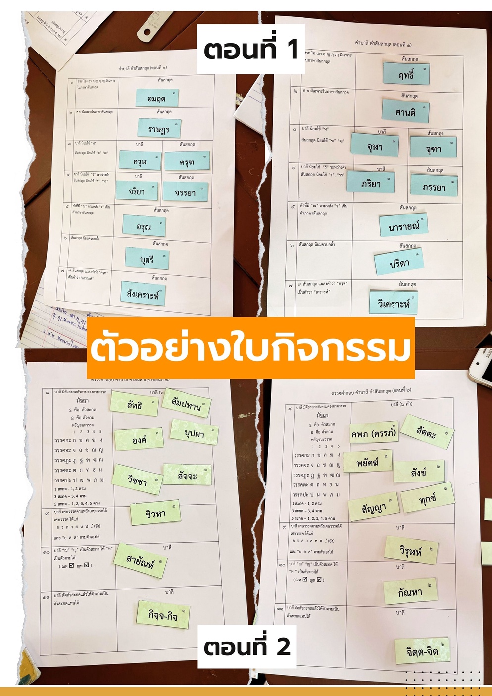 ❤️ ครูจะแบ่งใบกิจกรรมเป็น 2 ตอน ใช้เวลาตอนละ 1 คาบเรียน เพราะทดลองใช้ร่วมกันแล้วเวลาไม่เพียงพอ ทำให้นักเรียนไม่มีเวลาคิดวิเคราะห์เท่าที่ควร และในตอนที่ 2 อาจต้องทบทวนเรื่องพยัญชนะวรรค เรื่องตัวสะกดและตัวตามให้นักเรียนเป็นพื้นฐานก่อนทำกิจกรรม
