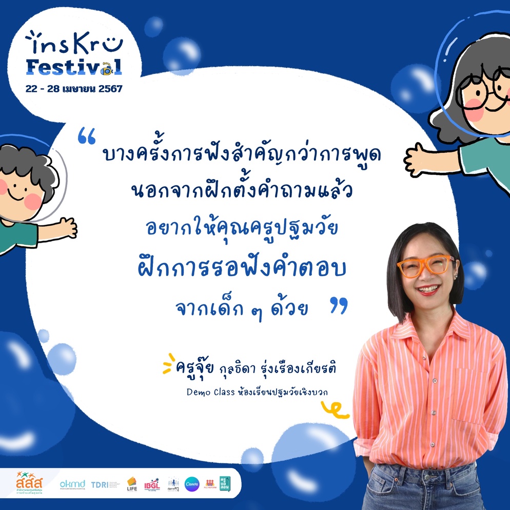 วันพุธที่ 24 เมษายน 2567 เวลา 10.00-12.00 น. ครูจุ๊ย-กุลธิดา รุ่งเรืองเกียรติ เปิด Demo Class จำลองห้องเรียนปฐมวัยเชิงบวก เป็นส่วนหนึ่งของกิจกรรม insKru Festival 2024 ตอน กล้าที่จะLearn