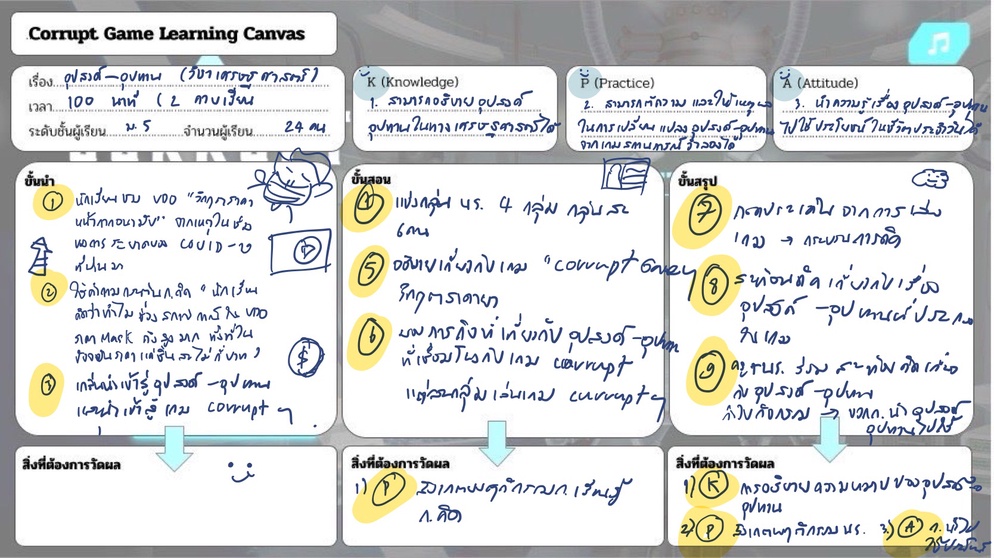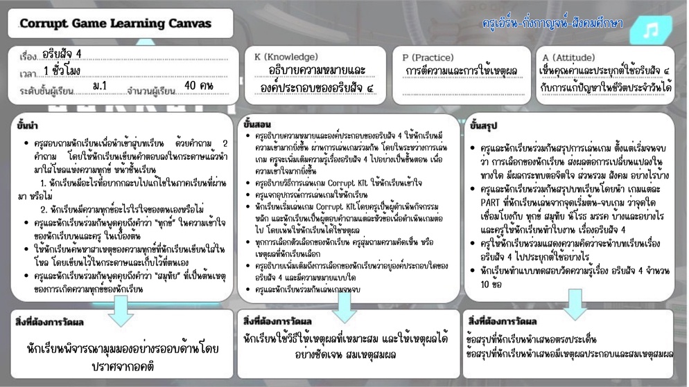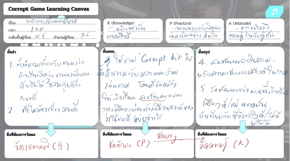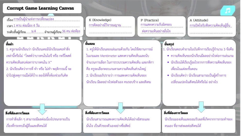 เล่มเกมไปพร้อม ๆ กัน คุณครูสามารถใช้คอมหรืออุปกรณ์ของคุณครูเข้าเกม Corrupt แล้วแสดงจอลง Projector สามารถใช้เทคนิคการพากย์เกมเพื่อบิวด์บรรยากาศ แล้วให้นักเรียนมีส่วนร่วมในการเลือกตัวเลือกในเกม เช่น การโหวตเสียงข้างมาก จากนั้นก็เลือกคำตอบตามเสียงโหวต อาจจะสุ่มถามความคิดเห็นนักเรียนแต่ละฝั่งว่าทำไมถึงเลือกตัดสินใจแบบนี้