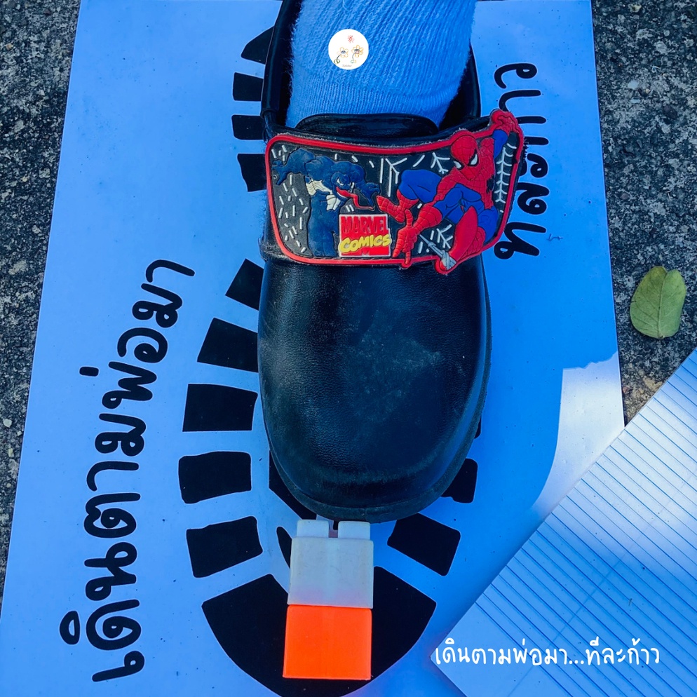 โดยเด็กจะนำเท้าของตัวเองวางลงไปบนรอยเท้าของพ่อแล้วทำการวัดขนาดความแตกต่างอย่างง่ายจากบล็อก